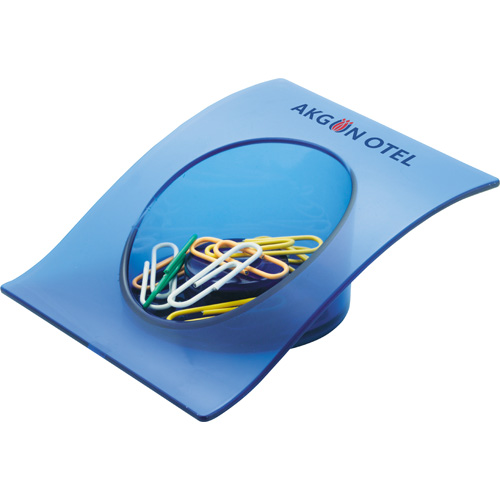 Magnetic desktop paper clip caddy. Includes 10 multi-color, vinyl-coated paper clips.
